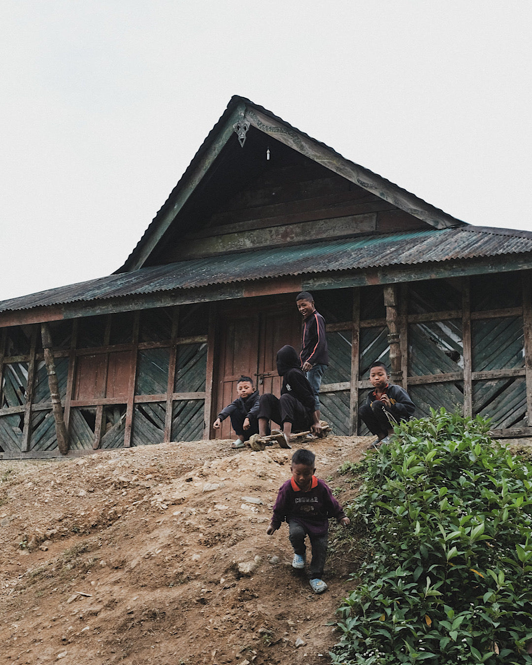 Il est 8h45 au Nagaland lorsque nous quittons l'hôtel, à la recherche de lits Naga. On fait une pause ravitaillement au marché pour acheter quelques bananes, et c’est le départ en direction de notre premier village. La route est en très mauvais état. Quelques maisons traditionnelles au toit de palme sont dispersées sur le chemin, et sinon, c'est la jungle. Après plusieurs heures de route, j’aperçois enfin dans l’une d’entre elles un lit Naga dans l’entrée. On s’arrête, des enfants en uniformes courent vers nous en riant, puis s’arrêtent et font demi-tour par timidité. Je prends des photos de la table, qui visiblement ici ne sert pas de lit : une paire de chaussures est posée dessus, un tuyau d'eau est entortillé tout autour, et l'un des pieds est posé sur une cale. Poussiéreuse, elle est située dans l'entrée, avant la porte de la maison, et pas à l'intérieur, contrairement à ce qu'on pourrait attendre d'un lit finalement. Nous reprenons la route.