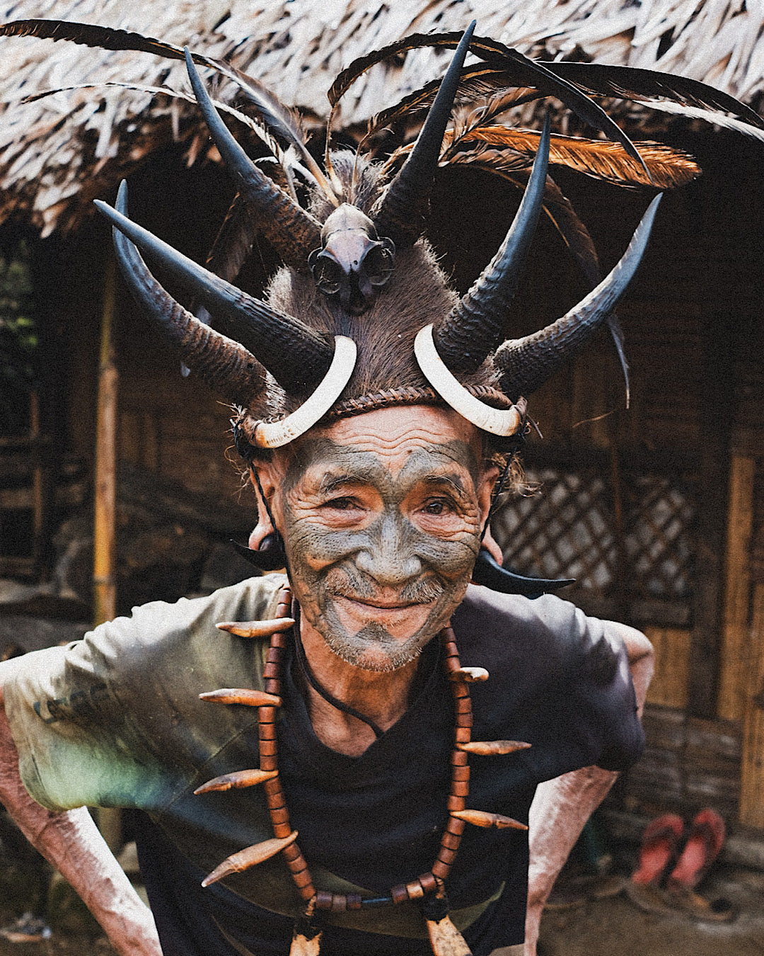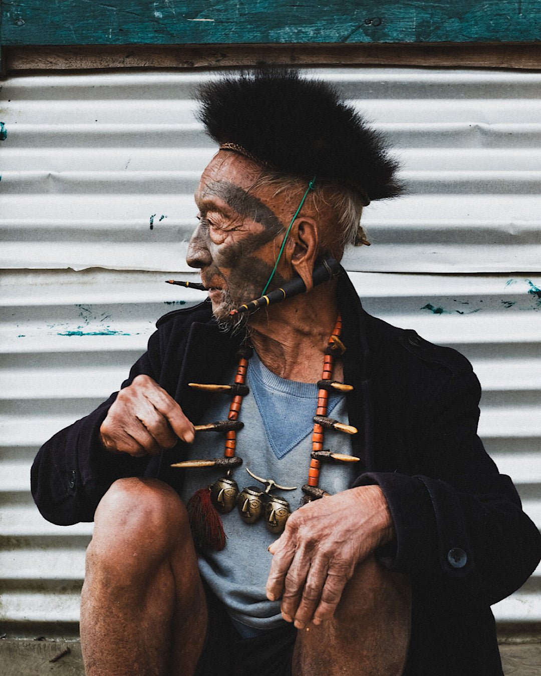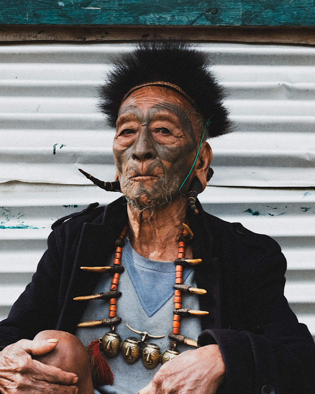 À l'entrée du village, nous arrêtons la voiture, et prenons à pied un petit sentier qui monte et qui mène à quelques maisons. De là, nous avons une superbe vue sur la vallée aux alentours. Les villages Naga sont traditionnellement perchés sur les collines, car auparavant, il fallait pouvoir voir venir les attaques ennemies. Les murs des maisons sont en bambou tressé, et les toits sont en paille. Nous allons dans quelques secondes rencontrer notre premier chasseur tatoué du voyage, un vieux monsieur qui s’appelle Kampei Wangnei, 86 ans. Il porte un short, un t-shirt et des tongs, ce qui contraste avec son collier traditionnel fait des griffes et de dents d’animaux, et sa coiffe de chasseur ornée de plumes et de cornes de chèvres sauvages qu’il semble avoir mis juste pour la photo. Il est l'un des derniers représentants des guerriers au visage tatoué du Nagaland. Le tatouage au visage est le signe de la plus haute distinction des guerriers Naga : les guerriers l'obtiennent après avoir coupé la première tête de leur ennemi, fait de guerre qui était hautement reconnu à l'époque. Le tatouage était réalisé à la main, par la femme du chef de la communauté. Au début du XXème siècle, le Nagaland était radicalement différent : la région était recouverte d'une forêt dense, et les nagas presque tous illétrés, animistes, polygames, et féroces. La pratique de la chasse à la tête était au coeur de la communauté Konyak : sans avoir pris de tête, un jeune homme ne pouvait devenir adulte et se faire tatouer. Les conflits entre tribus étaient ainsi permanents.