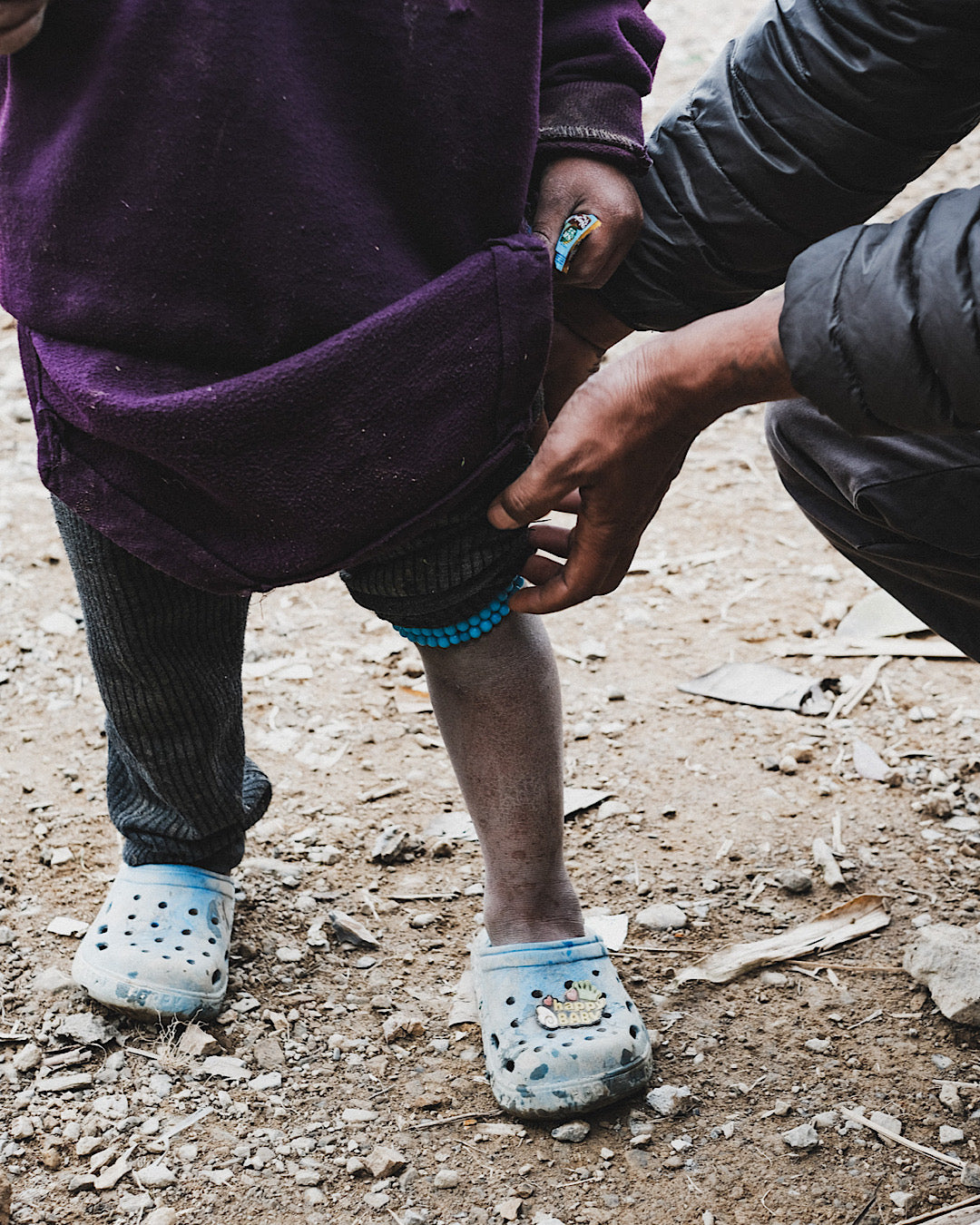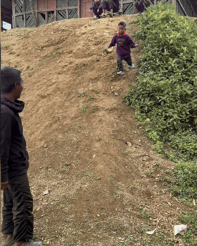 Devant le morung, des enfants et ados jouent avec un chariot fait d’une planche et de roues en bois, comme une luge. Ankush distribue des bonbons qu’il a achetés auparavant. Un jeune enfant dévale la pente et on entend comme un son de clochettes qui semble venir du garçon. On nous dit que c'est le signe que l'enfant est le descendant de l'Angh, le chef du village. Et en effet, au niveau du genou du garçon, sous le pantalon, on aperçoit deux bracelets de perles turquoise, signe qu’il sera un jour chef de village. Dans cette partie du Nagaland, les chefs se transmettent le pouvoir de génération en génération, du père au fils ainé.