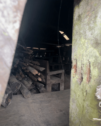 Un peu plus loin, nous nous arrêtons pour visiter le premier morung du voyage, un de ces dortoirs masculins où se faisait l’éducation des jeunes hommes auparavant. Le morung est condamné, mais en regardant par un trou dans le mur je vois plein de petits lits Naga empilés, abandonnés. Les hommes qui occupaient le morung auparavant dormaient donc bien sur ces lits. Derrière le bâtiment, on retrouve un « log drum », un long tronc vidé et transformé en tambour géant, à l’aide d’une longue fente créée dans la longueur sur le dessus. À l’intérieur, on y trouve les bâtons qui servent à frapper le tambour. On nous indique que ceslog drumsservaient dans le passé à alerter le village d’attaques ennemies.