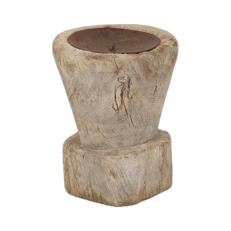 Pièce uniqueCe bougeoir a été réalisé à partir d'un ancien semoir en bois, sculpté à la main. Les paysans attachaient autant de tuyaux qu'il y a de trous sous le semoir, déposaient les graines dans l'entonnoir sur le dessus, et à mesure qu'ils labouraient la terre, ils pouvaient ainsi semer plusieurs rangées à la fois. Nos artisans l'ont transformé en bougeoir en rajoutant une coupelle en métal sur l'entonnoir afin de pouvoir y poser une bougie. Étant un objet ancien d'usage quotidien, il est possible que des traces du temps soient visibles.
