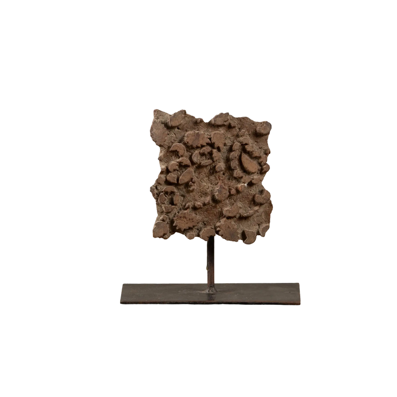 Ces blocs anciens ont servi dans une première vie à imprimer des tissus à l'aide de pates de pigments colorés. Cette technique, dite du blockprint, est encore aujourd'hui très répandue dans les ateliers du Rajasthan, notamment à Jaipur. Les blocs proposés ici sont anciens et portent les signes du temps. Chaque pièce est unique, montée sur son pied en fer.