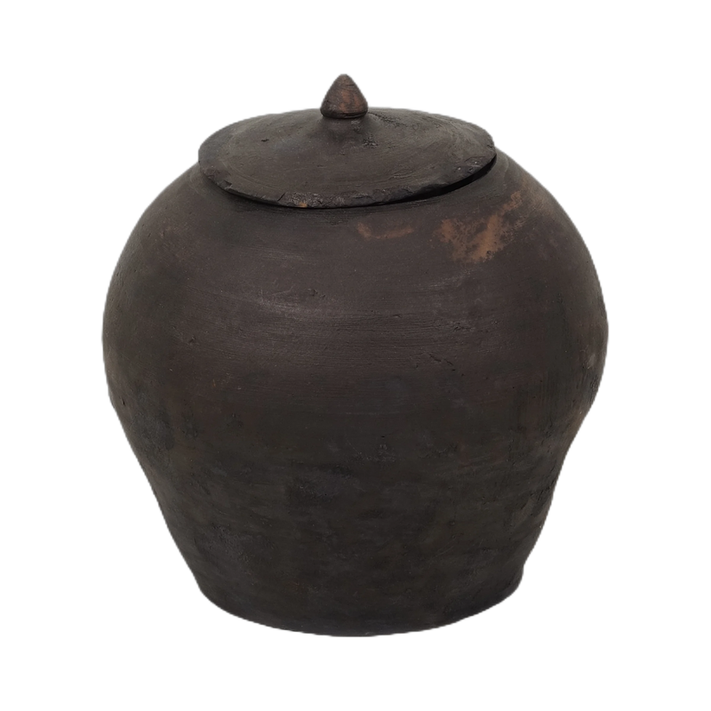 Utilisé autrefois pour la conservation de denrées alimentaires comme le riz, les épices ou les herbes médicinales, ce pot fonctionnel révèle aujourd’hui un charme brut parfait pour une décoration wabi-sabi ou bohème. Sa silhouette généreuse et son couvercle conique le rendent aussi sculptural qu’utilitaire.
