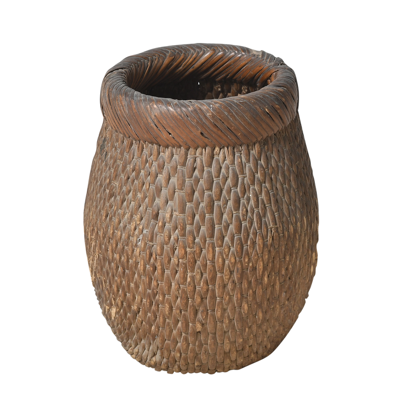 Panier ancien en rotin tressé à la main, probablement utilisé par les pêcheurs des campagnes chinoises pour transporter leur prise du jour. Sa forme ventrue à large ouverture et son bord roulé robuste témoignent d'un artisanat purement fonctionnel, conçu pour un usage quotidien intensif.
