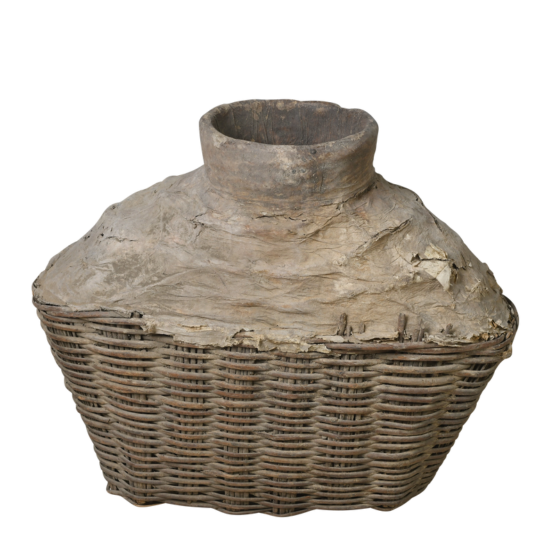 Sa forme renflée à col étroit et sa texture contrastée entre l'osier et l'argile craquelée en font un objet décoratif singulier, à intégrer dans un intérieur wabi-sabi ou une collection ethnographique.