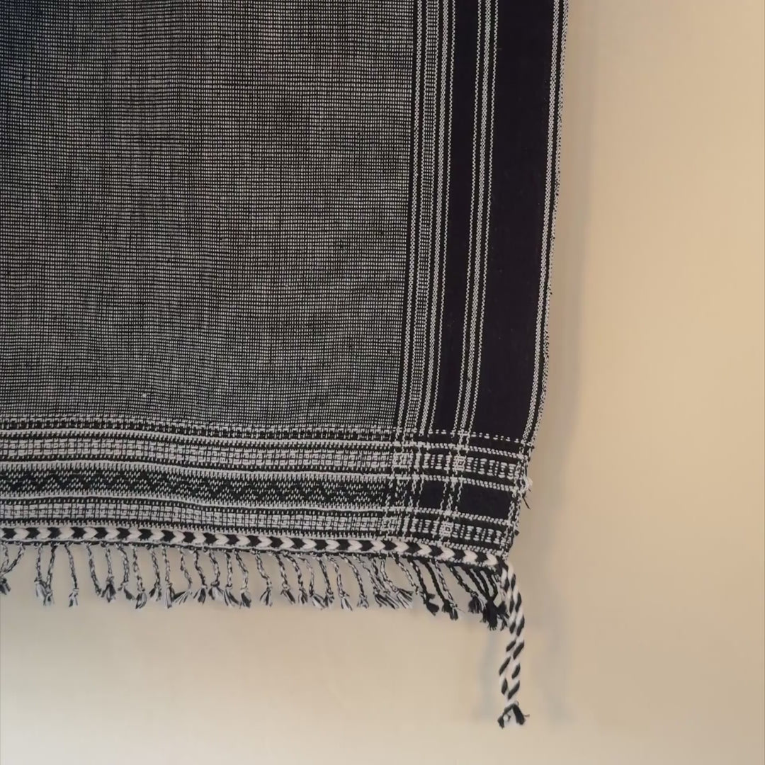 Plaid en coton, entièrement tissé à la main sur un métier à tisser traditionnel dans la région de Bhuj, au Gujarat (Inde). Ce savoir-faire ancestral se reflète dans chaque détail de ce textile, de la texture dense et robuste du coton à la richesse de ses motifs géométriques traditionnels.