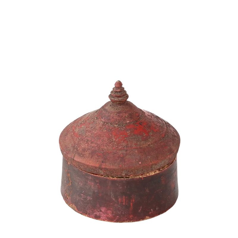 Pièce uniqueAncienne boîte en bois tourné qui servait à conserver la poudre tikka (rouge, orange, rose), utilisée pour les rites religieux.