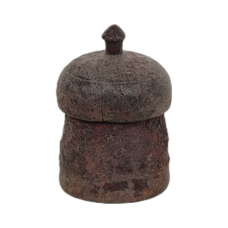 Ancienne boîte laquée en bois tourné qui servait à conserver la poudre tikka (rouge, orange, rose), utilisée pour les rites religieux.
