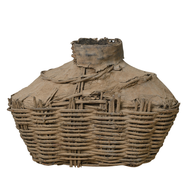 Sa forme renflée à col étroit et sa texture contrastée entre l'osier et l'argile craquelée en font un objet décoratif singulier, à intégrer dans un intérieur wabi-sabi ou une collection ethnographique.