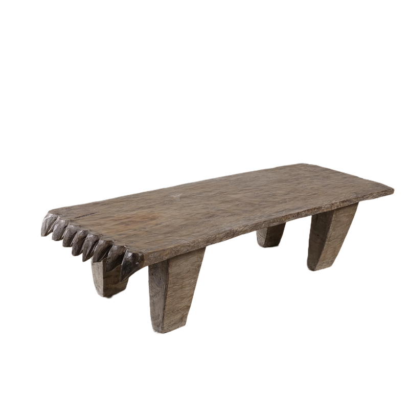 Cette table Naga provient du Nagaland, un état indien situé à l'extrême Nord-Est de l'Inde, peuplé d'une mosaïque de tribus. Dans cette région, ces 'tables basses' sont en fait des lits, et sont sculptées à la main dans un seul morceau de bois. De ce fait, chaque pièce est unique. Cette pièce était sûrement le lit d'un guerrier ou d'un chef Naga, du fait de sa taille et de ses sculptures, qui représentent des têtes de calao, l'oiseau emblématique du Nagaland.