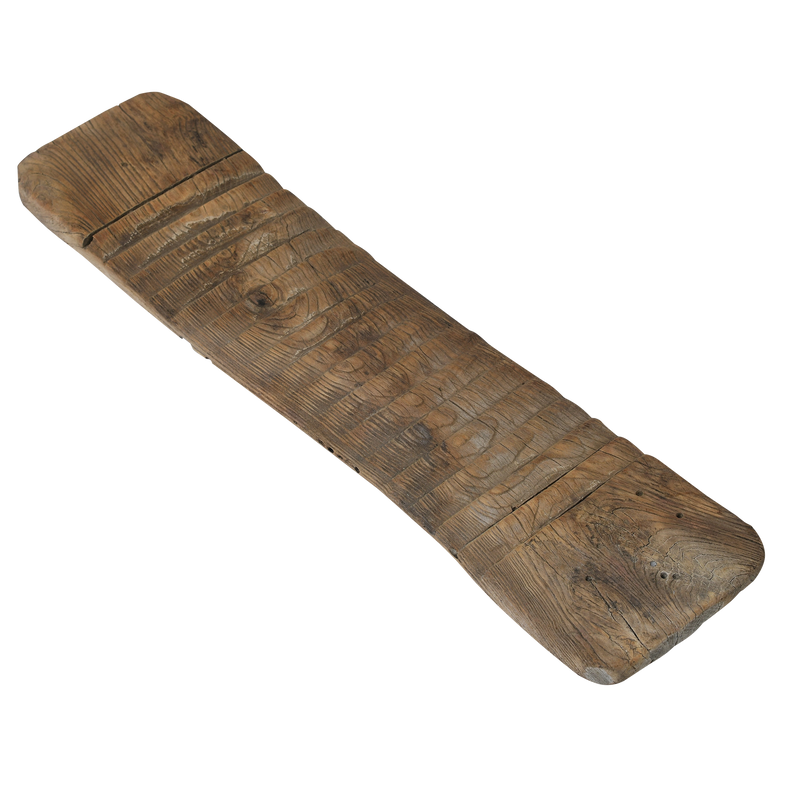 Utilisée pendant des décennies dans les foyers chinois pour laver les habits à la main, cette planche à laver témoigne d'un usage quotidien intense. Le bois massif, blanchi et patiné par le temps, a développé une teinte grise naturelle d'une grande douceur. Sa surface rainurée, taillée à la main, garde les traces de chaque frottement, autant de marques qui font toute la valeur de l'objet.