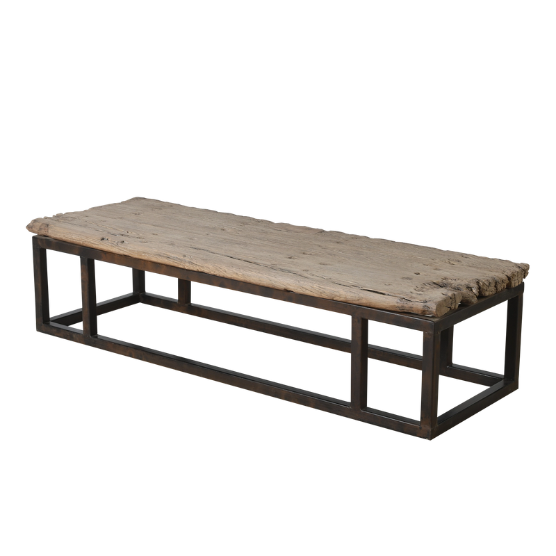 Le bois ancien conserve ses irrégularités naturelles, témoignant de son histoire, tandis que la base en métal apporte stabilité et contraste.