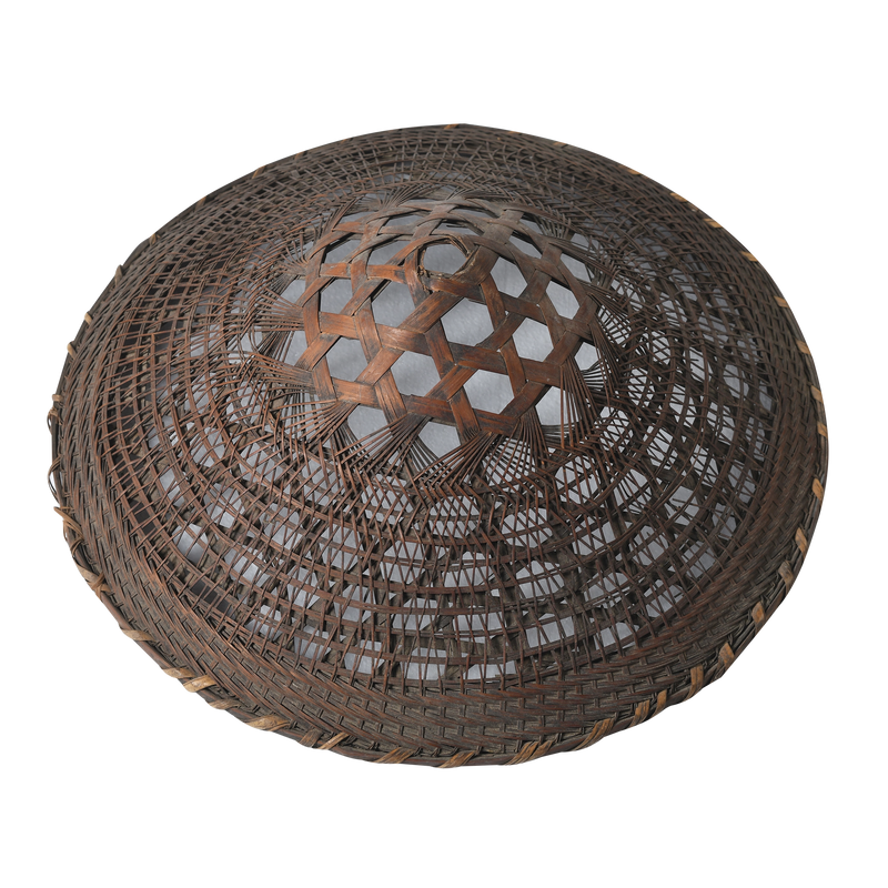 Réalisé à partir de fines lamelles de bambou tressées à la main, il présente un motif géométrique concentrique qui témoigne d’un savoir-faire artisanal transmis de génération en génération. Les variations de teinte, les irrégularités du tressage et la patine sombre résultent de l’usage et du vieillissement naturel du matériau.