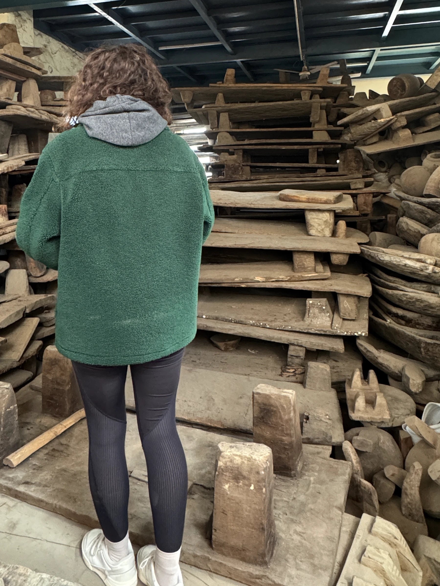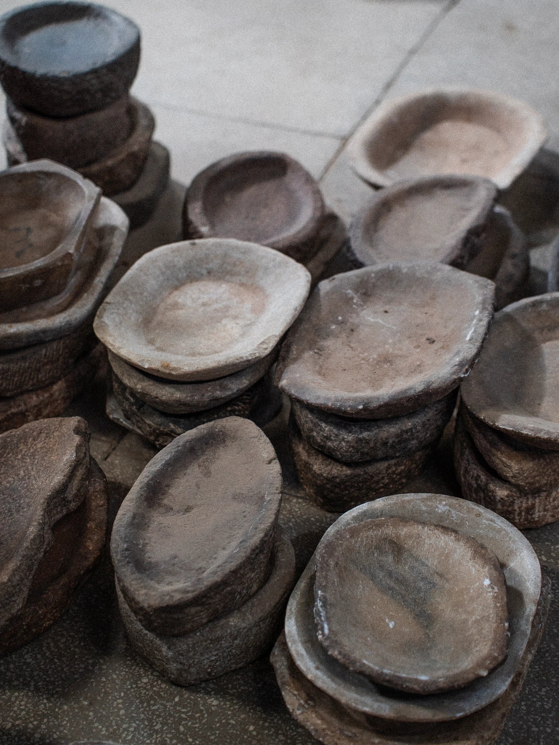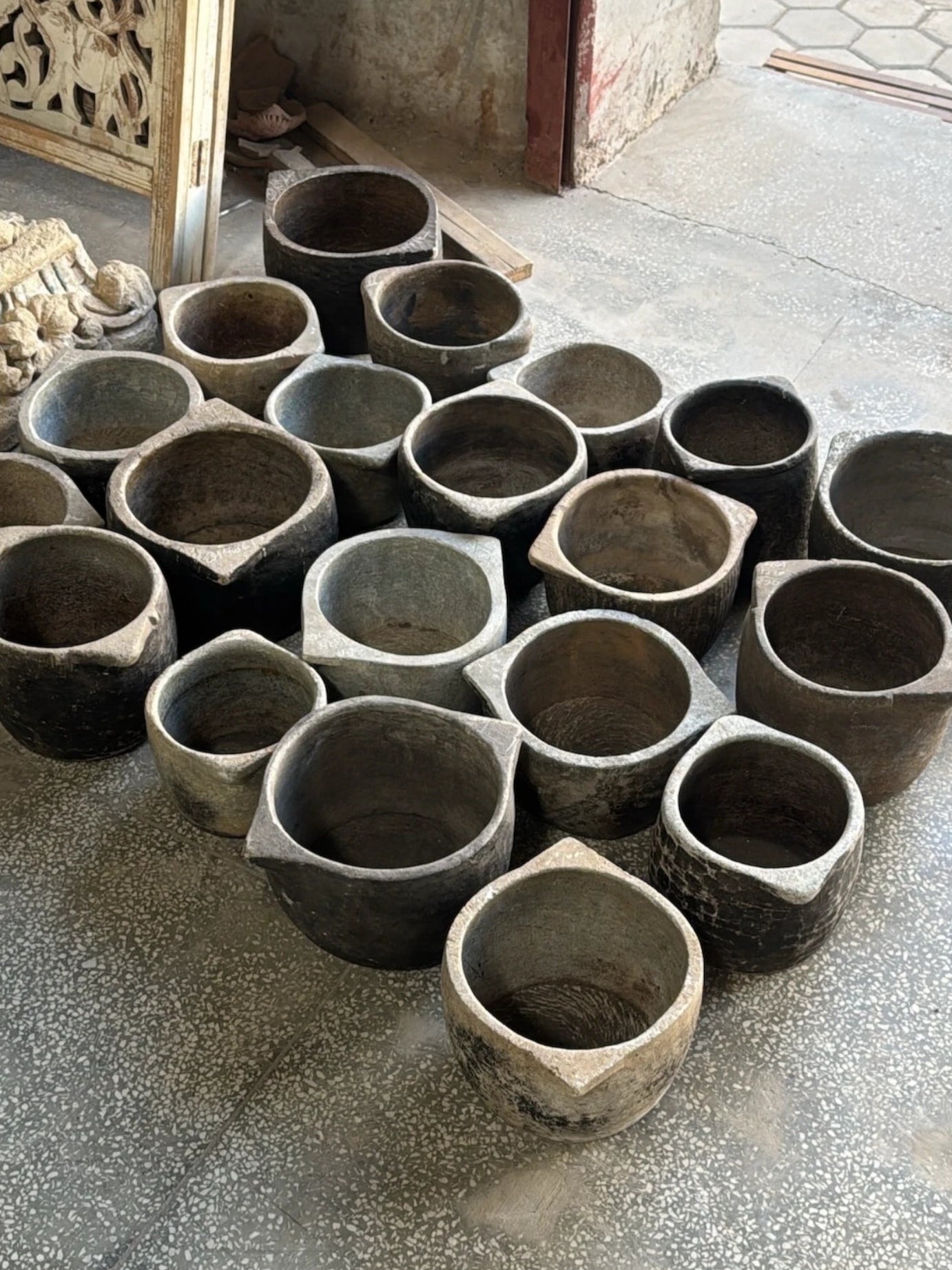 Au-delà du bois, les artisans indiens excellent dans le travail de la pierre, autant dans la construction d'ouvrages majestueux comme des temples, que pour des ustensiles du quotidien. Dans les villages, les plats en pierre sont par exemple toujours utilisés pour la cuisine. Nous avons déniché des objets sculptés à la main dans du grès local ou du marbre : piliers décoratifs, niches, plats... Chaque pièce porte la trace du ciseau de l'artisan, ces imperfections délibérées qui signent le fait-main. À cela s'ajoutent plusieurs décennies d'usage qui arrondissent les angles, lissent les surfaces.
