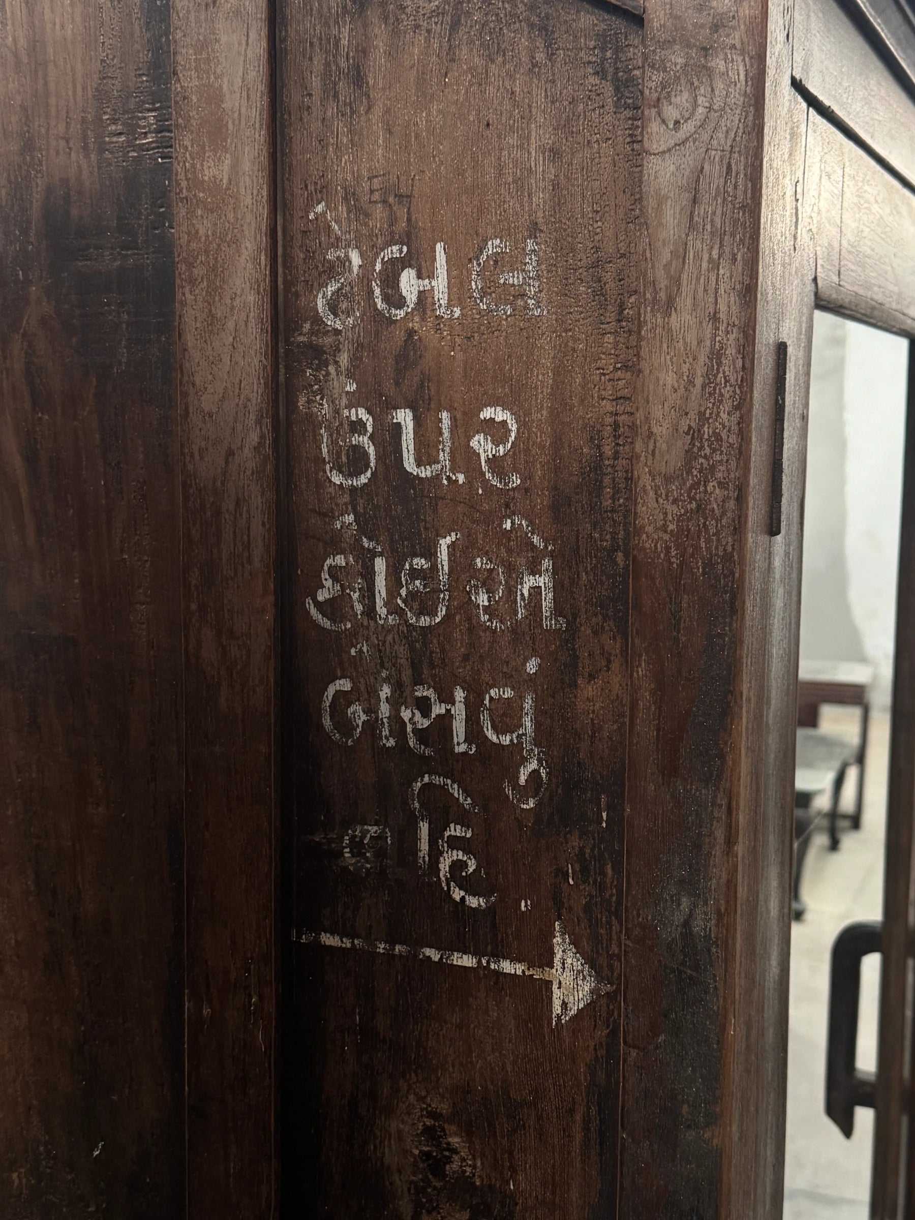 Inscription en Gujarati qui conseillait probablement le sens de stockage pour le transport de ce meuble vitré