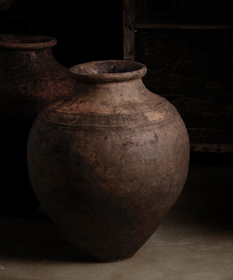 Chaque jarre est une pièce ancienne réalisée à la main dans la région de l’Alentejo, au Portugal, vers 1850. Utilisées à l’origine pour stocker l’huile d’olive dans les fermes rurales, elles sont fabriquées en terre cuite épaisse, ce qui leur confère une grande solidité et un poids important.