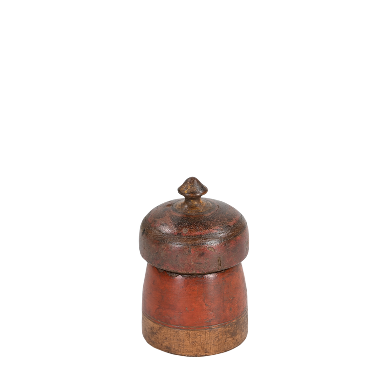 Ancienne boîte laquée en bois tourné qui servait à conserver la poudre tikka (rouge, orange, rose), utilisée pour les rites religieux.