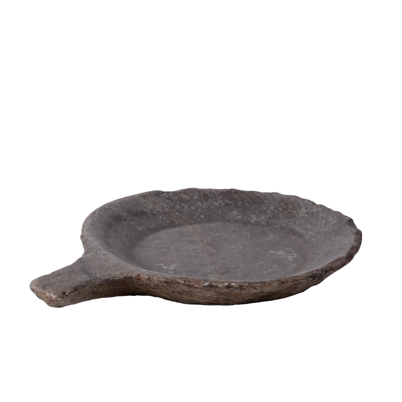 Pièce uniqueAncien plateau en marbre. Dans l'Inde rurale, l'usage d'ustensiles en pierre était prépondérant pour de nombreux usages en cuisine, allant de la mouture à la cuisson. Ainsi, ce plateau a-t-il pu servir comme mortier pour moudre les épices et autres grains, ou encore comme plan de travail pour pétrir la pate à chapatis.