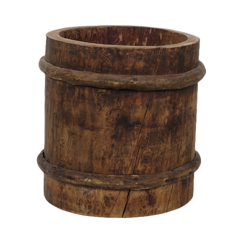 Ce seau chinois en bois de pin, façonné à la main, témoigne d’un artisanat utilitaire aujourd’hui rare. Sa patine profonde, marquée par le temps, révèle les traces de son usage quotidien, probablement dans un contexte agricole ou domestique. Les cerclages en bois massif apportent stabilité et caractère, tandis que sa forme cylindrique classique en fait une pièce aussi décorative que pratique.