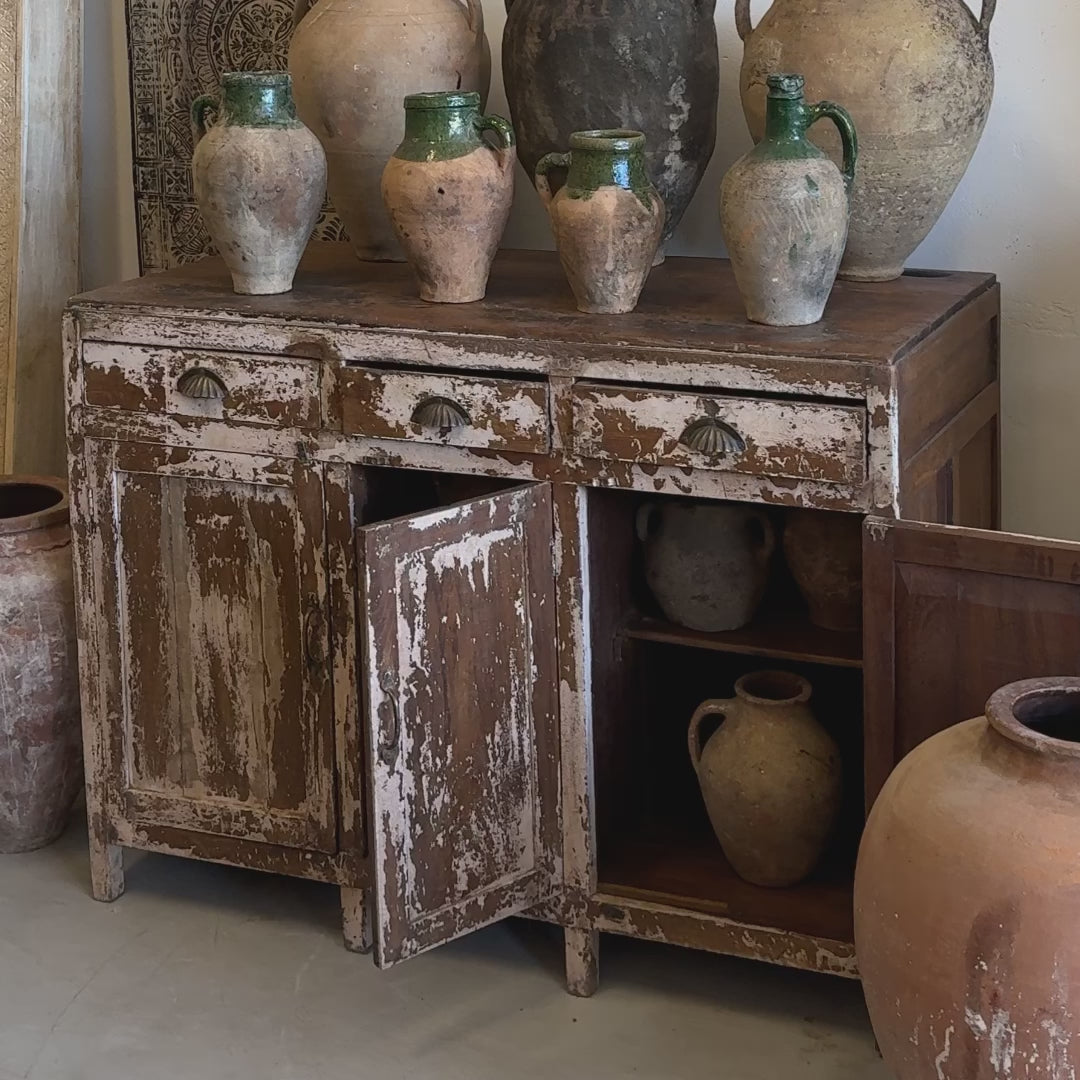 Ancien buffet en teck, à la patine d'origine. Tres pratique, il possède trois portes qui donnent sur un grand volume traversé par une étagère, ainsi que trois tiroirs. Sa profondeur et son solide plateau en bois massif le rendent parfait pour une utilisation en tant qu’îlot de cuisine.