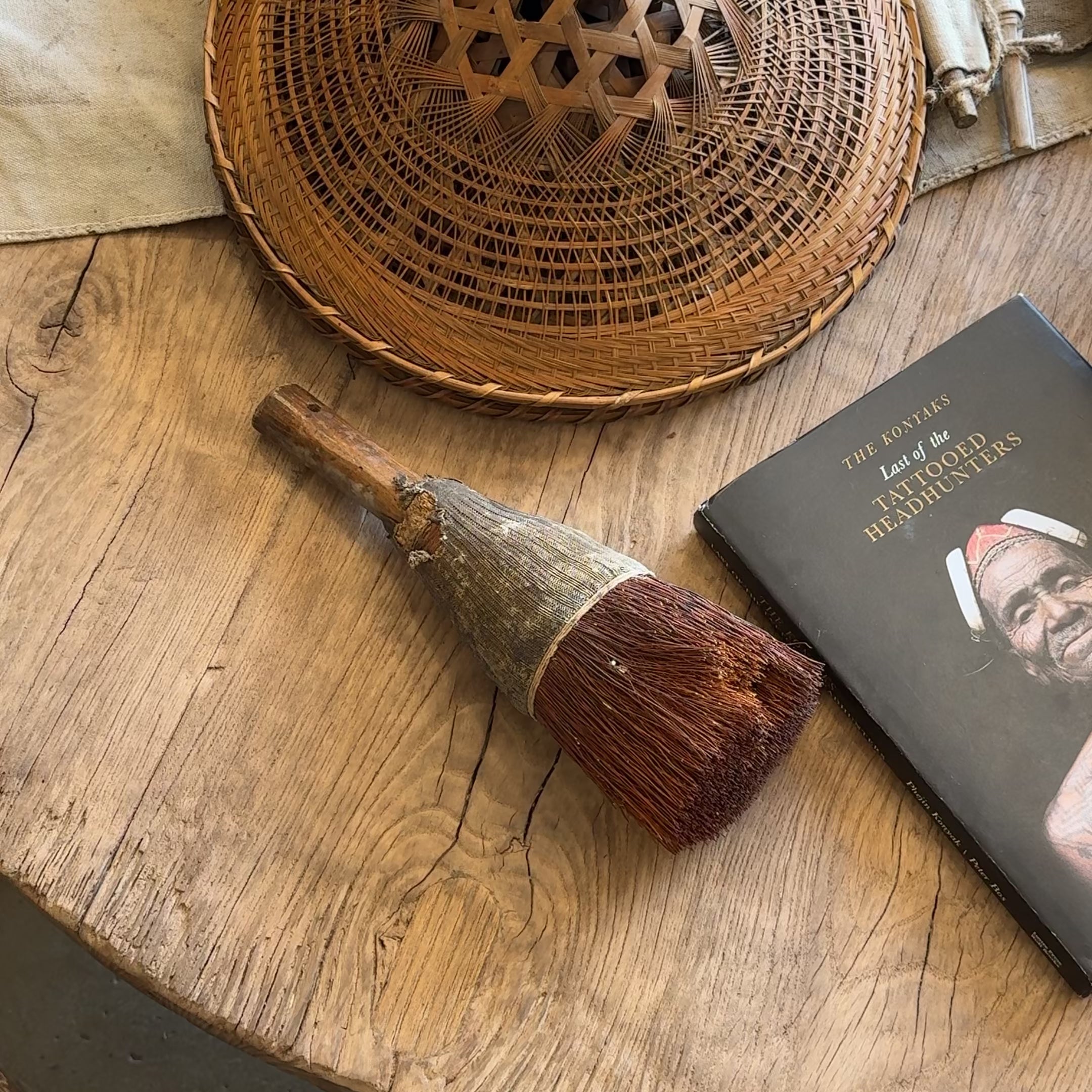 Larges pinceaux/brosses chinois, faits d'un manche en bois, et de brindilles fixées par une cordelette pour la brosse.