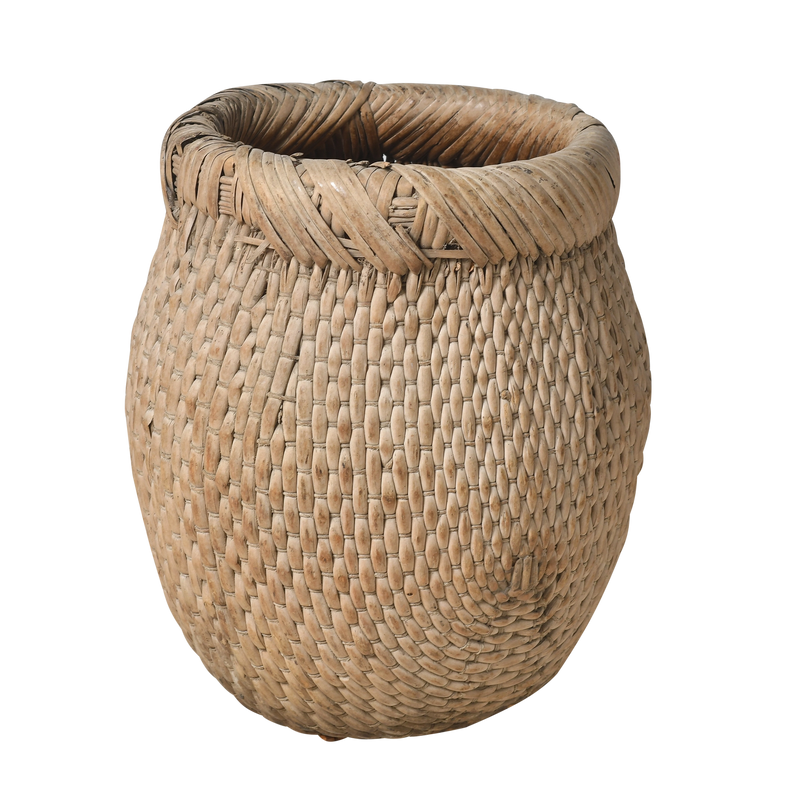 Panier ancien en rotin tressé à la main, probablement utilisé par les pêcheurs des campagnes chinoises pour transporter leur prise du jour. Sa forme ventrue à large ouverture et son bord roulé robuste témoignent d'un artisanat purement fonctionnel, conçu pour un usage quotidien intensif.