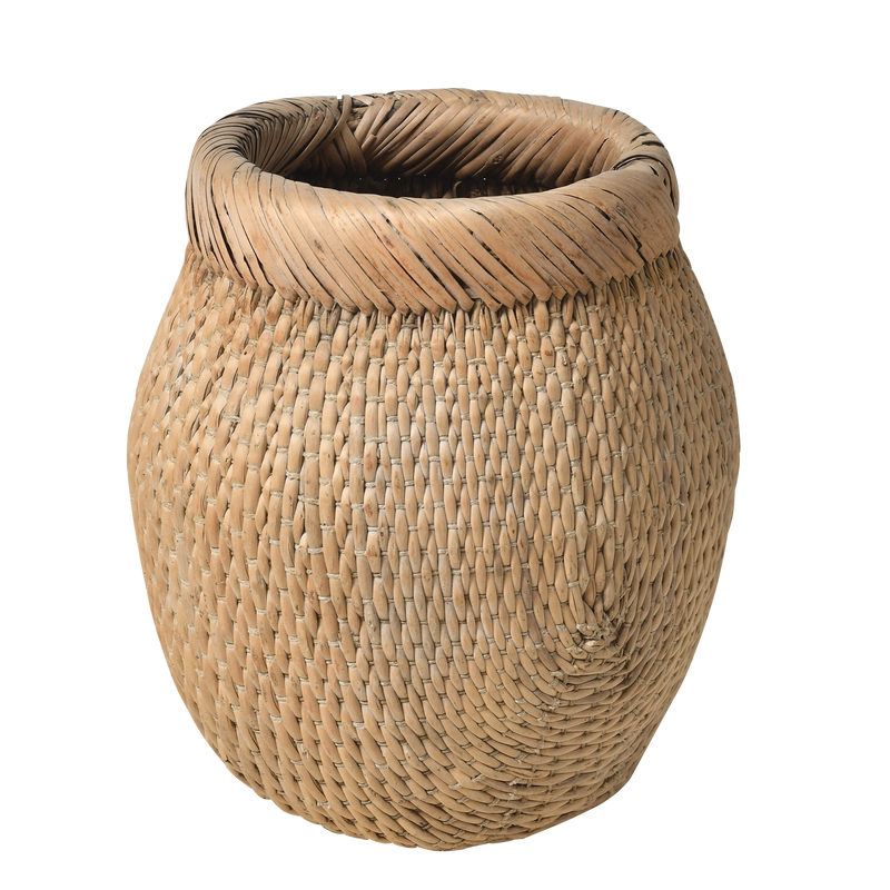 Panier ancien en rotin tressé à la main, probablement utilisé par les pêcheurs des campagnes chinoises pour transporter leur prise du jour. Sa forme ventrue à large ouverture et son bord roulé robuste témoignent d'un artisanat purement fonctionnel, conçu pour un usage quotidien intensif.