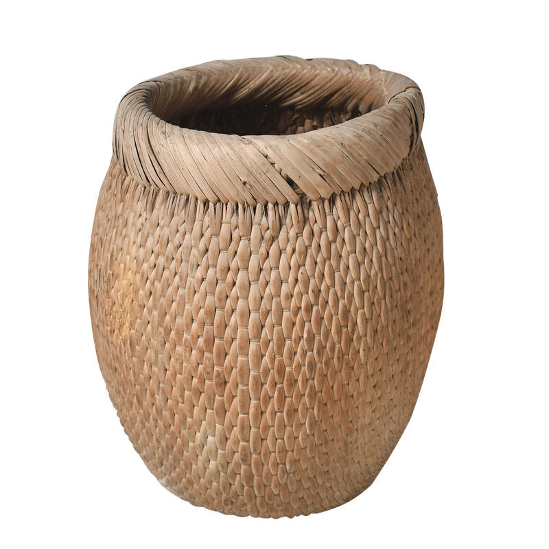 Panier ancien en rotin tressé à la main, probablement utilisé par les pêcheurs des campagnes chinoises pour transporter leur prise du jour. Sa forme ventrue à large ouverture et son bord roulé robuste témoignent d'un artisanat purement fonctionnel, conçu pour un usage quotidien intensif.
