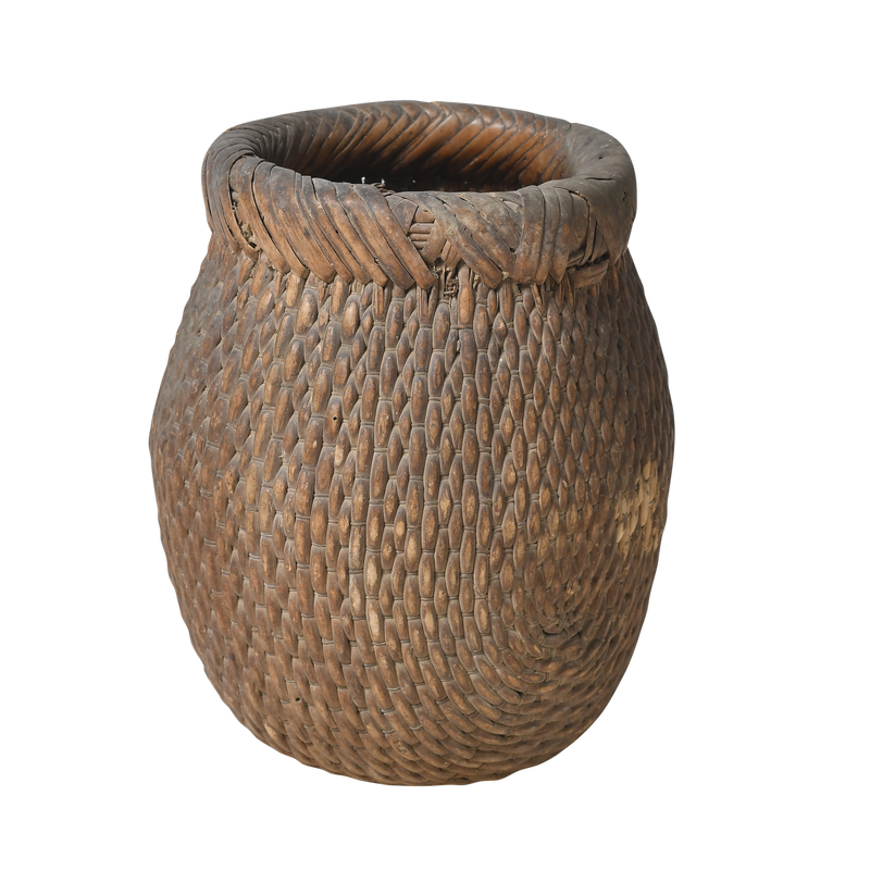 Panier ancien en rotin tressé à la main, probablement utilisé par les pêcheurs des campagnes chinoises pour transporter leur prise du jour. Sa forme ventrue à large ouverture et son bord roulé robuste témoignent d'un artisanat purement fonctionnel, conçu pour un usage quotidien intensif.