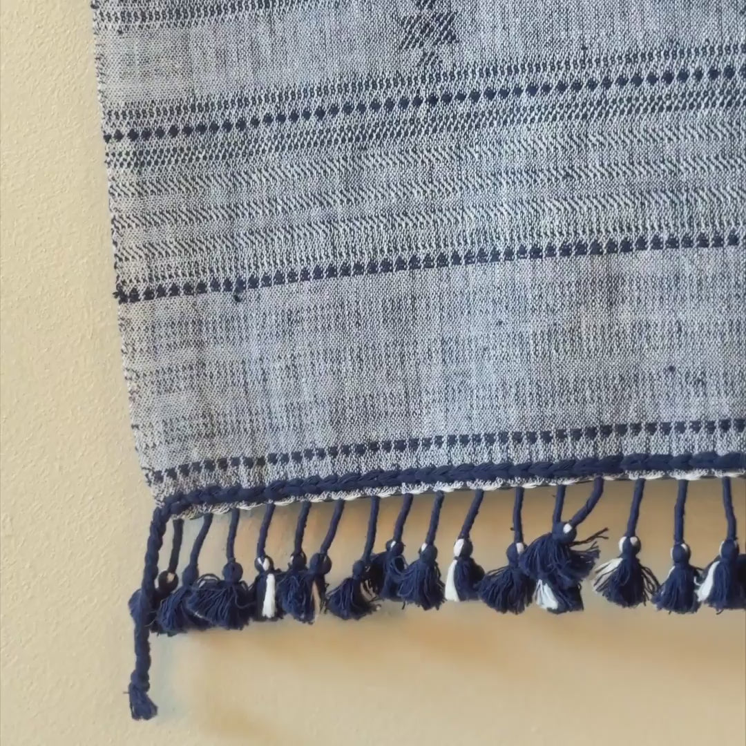 Les motifs délicats et les finitions à pompons sont typiques de la culture textile de Bhuj. Chaque élément est minutieusement travaillé, faisant de ce textile une pièce unique.