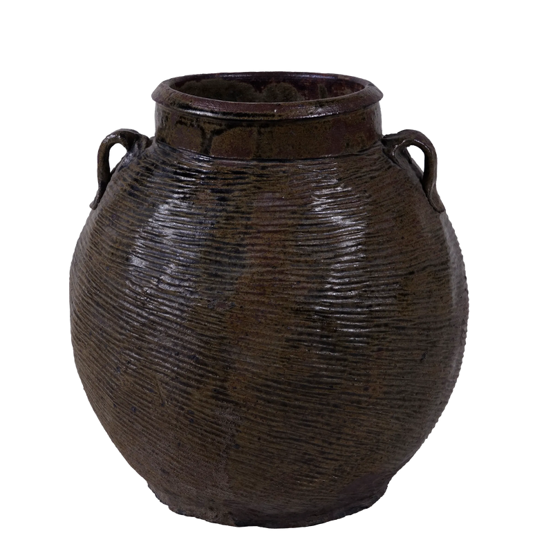 Cette jarre ancienne en terre cuite présente une texture striée irrégulière, entièrement réalisée à la main. Sa glaçure naturelle aux tons bruns et verts rappelle les objets utilitaires traditionnels du sud de la Chine. Deux petites anses latérales suggèrent une fonction de transport ou de stockage, peut-être pour des huiles, des herbes ou des condiments.