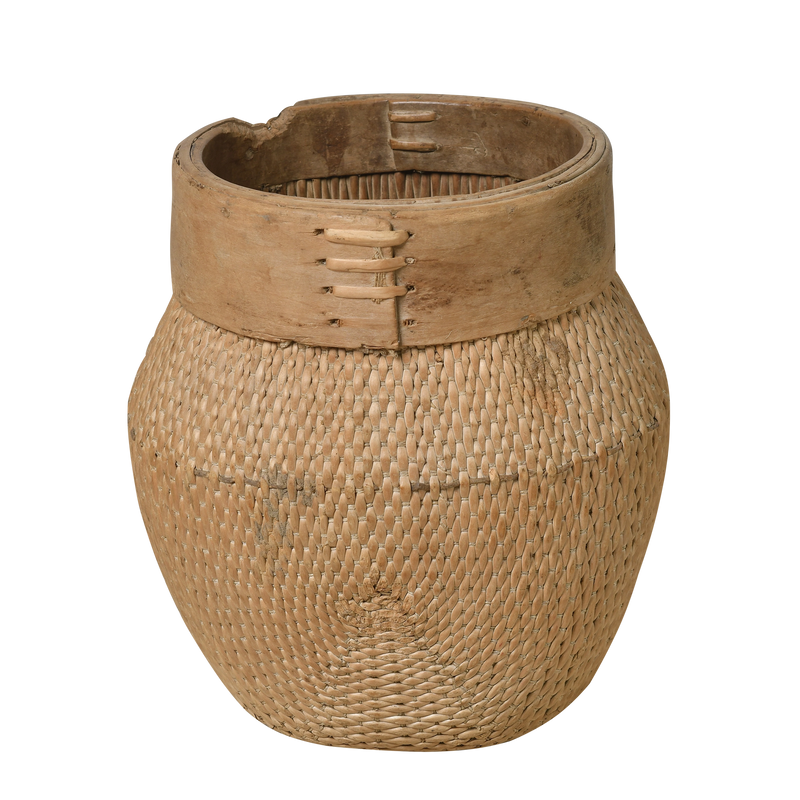 Panier ancien en roseau et saule, autrefois utilisé par les pêcheurs des campagnes chinoises pour conserver leur prise du jour. Sa forme ventrue et son rebord cerclé de bois témoignent d'un artisanat purement fonctionnel, pensé pour durer.
