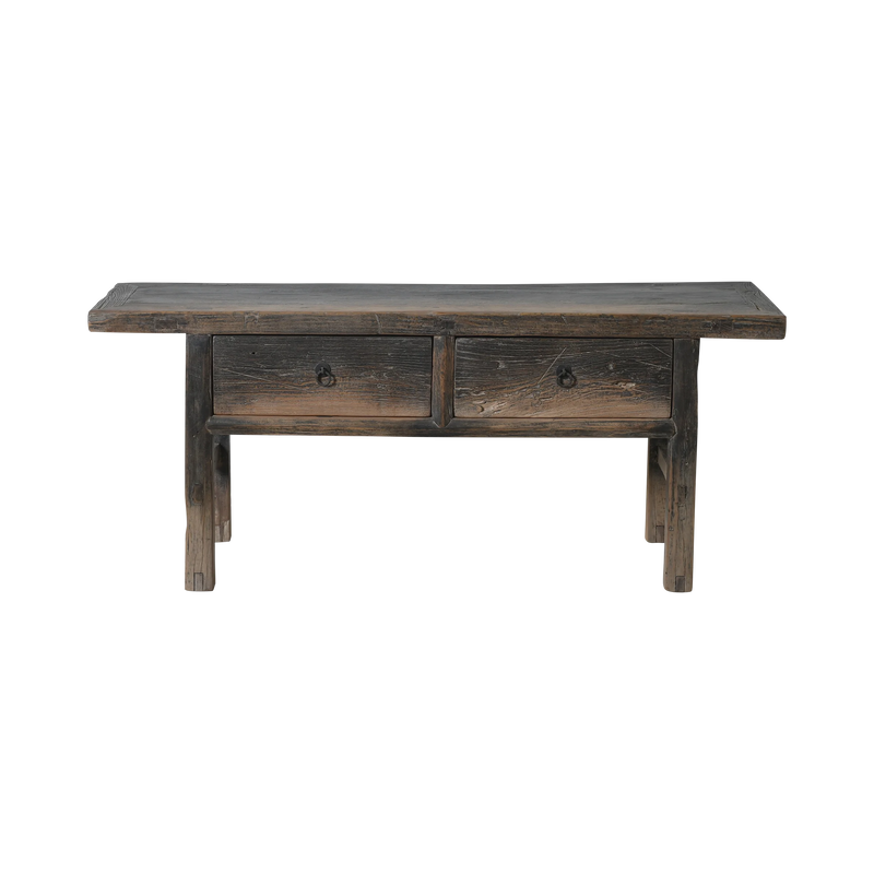 Cette console basse en orme ancien se distingue par sa silhouette simple et robuste, typique du mobilier rural chinois.
