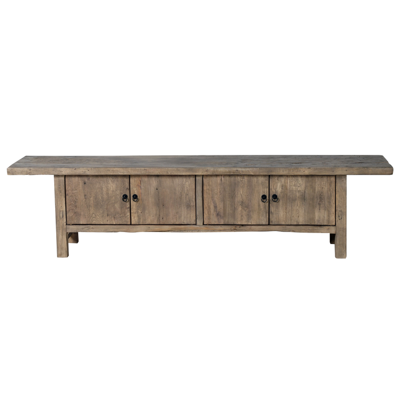 Sa silhouette allongée et ses quatre portes en façade lui confèrent une grande capacité de rangement tout en conservant une ligne visuelle épurée. Le plateau conserve ses bords irréguliers d’origine, apportant une touche organique qui souligne le travail artisanal. Grâce à sa hauteur basse, ce meuble peut aussi bien servir de meuble TV que de banc de rangement ou de console dans un intérieur contemporain, rustique ou minimaliste.