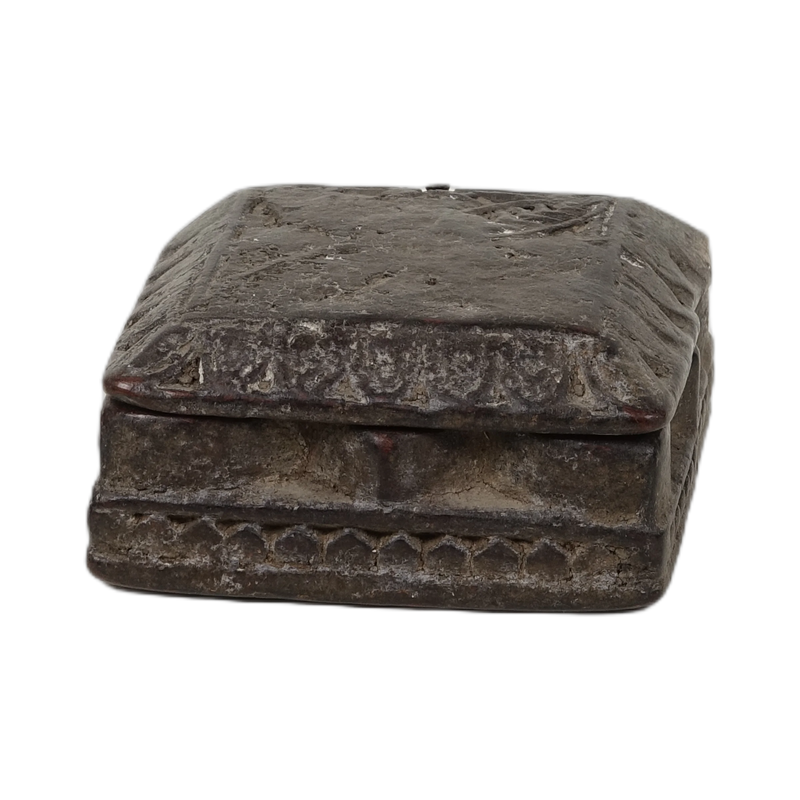 Pièce uniqueBoîte indienne ancienne en bois. Ces boîtes anciennes en bois étaient utilisées pour conserver des poudres de pigments, notamment utilisée pour tracer le sindoor - le trait de couleur rouge tracé à partir du haut du front et qui continue sur la raie des cheveux - qui indique qu'une femme est mariée. Certaines boîtes conservent encore parfois les traces de ces pigments.