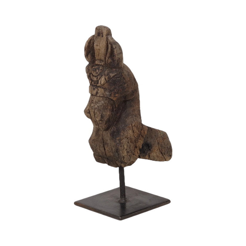 Pièce uniqueCette sculpture exceptionnelle représente un cheval cabré stylisé, finement sculpté à la main dans un bois massif ancien. Elle provient d’un élément architectural traditionnel du sud de l’Inde et pouvait être placée au sommet d’une porte, ou bien fixée sur un char de procession ou une structure rituelle. Sa posture dynamique et sa composition détaillée illustrent la richesse des symboles associés au cheval dans l’art sacré indien : force, loyauté, énergie spirituelle.