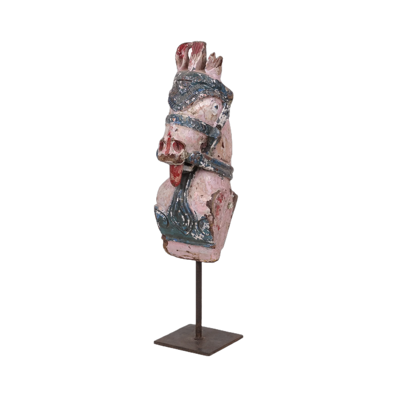 Le bois présente une belle patine ancienne. Montée aujourd’hui sur un socle en métal, elle devient une œuvre sculpturale idéale pour un intérieur contemporain, bohème ou de collection.