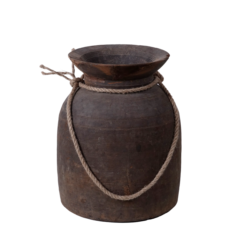 Pièce uniqueAncien pot à lait fait à la main en provenance de l’état indien de l’Himachal Pradesh, en région Himalayenne. Dans cet état en particulier, et aussi au Népal, ces pots en bois tourné étaient très communs il y a encore une cinquantaine d'années. Aujourd'hui, ils sont largement remplacés par des équivalents en métal ou en plastique.