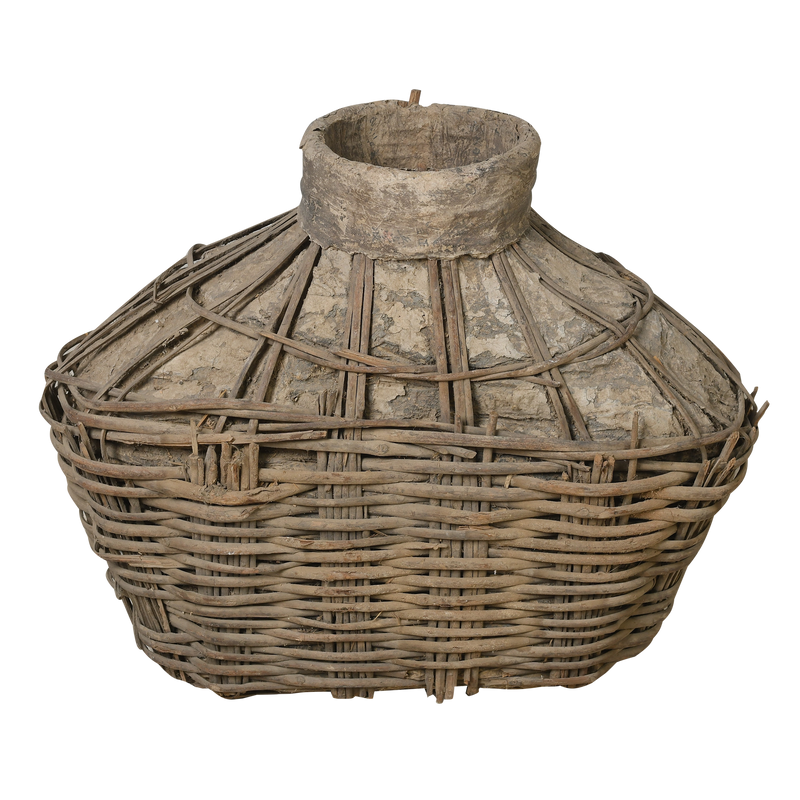 Sa forme renflée à col étroit et sa texture contrastée entre l'osier et l'argile craquelée en font un objet décoratif singulier, à intégrer dans un intérieur wabi-sabi ou une collection ethnographique.