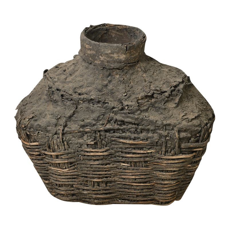 Sa forme renflée à col étroit et sa texture contrastée entre l'osier et l'argile craquelée en font un objet décoratif singulier, à intégrer dans un intérieur wabi-sabi ou une collection ethnographique.
