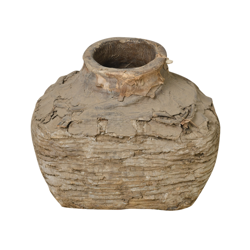 Sa forme renflée à col étroit et sa texture contrastée entre l'osier et l'argile craquelée en font un objet décoratif singulier, à intégrer dans un intérieur wabi-sabi ou une collection ethnographique.