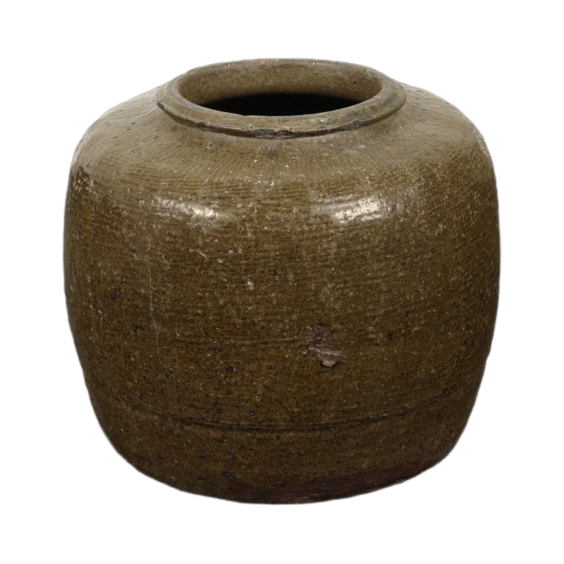 Pot ancien en grès émaillé marron à stries, provenant de la province du Shandong, au nord de la Chine. Fabriqué à la main entre la fin du XIXème jusqu'au début du XXe siècle, cette poterie était traditionnellement utilisée pour conserver de l'alcool de riz, de l'eau ou des aliments fermentés. Son émail noir profond et brillant, caractéristique des poteries utilitaires de cette région, témoigne d’un savoir-faire rural sobre et authentique.