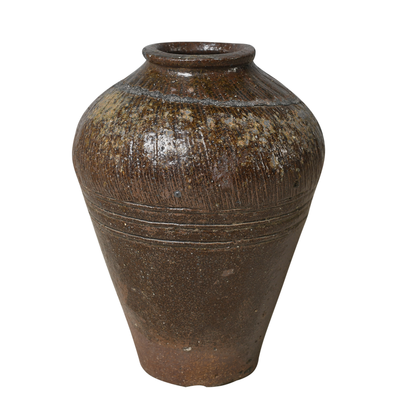 Cette jarre ancienne en grès, originaire du Nord de la Chine, est reconnaissable à sa forme caractéristique, son col étroit et ses motifs striés sur la moitié haute.