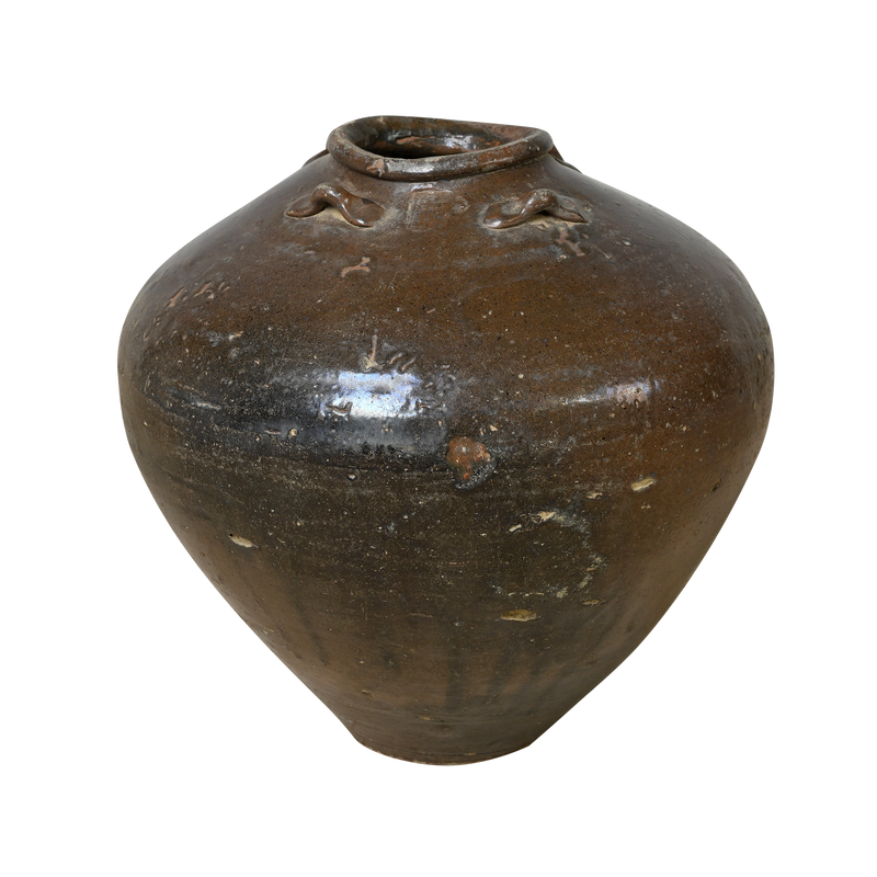 Jarre ancienne en grès émaillé, tournée à la main dans les ateliers ruraux du nord de la Chine, probablement province du Shanxi ou du Hebei. Sa panse généreuse, son col court et ses petits ergots d'épaule en font un type de récipient de stockage répandu dans les campagnes chinoises du XIXe siècle et début XXème, utilisé pour conserver le vin de riz, le vinaigre ou l'huile. Sa glaçure brun-noir dense, aux reflets légèrement irisés, témoigne d'une cuisson à haute température maîtrisée. Les marques du temps, écaillures et variations de surface, font partie de son caractère. Un objet sobre et solide, à poser comme une sculpture dans un intérieur contemporain ou une collection ethnographique.